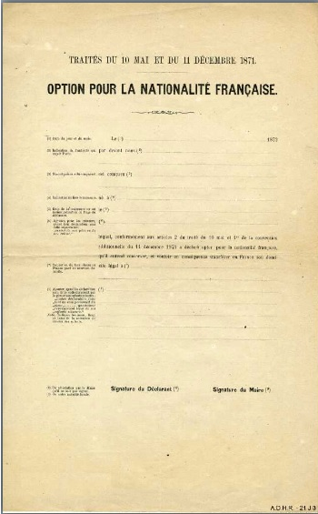 Le "droit d'option" est ouvert jusqu'au 1er octobre 1872. Droit ouvert uniquement aux alsaciens-mosellans qui ne résidaient pas en Alsace-Moselle. Rester signifiait acquérir d'office la nationalité allemande.